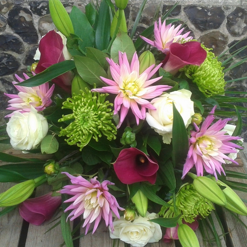 & Free ShippingA beautiful bright mix of Dahlias, shamrocks, avalanche roses, scented white lilies and gorgeous deep pink calla lilies.